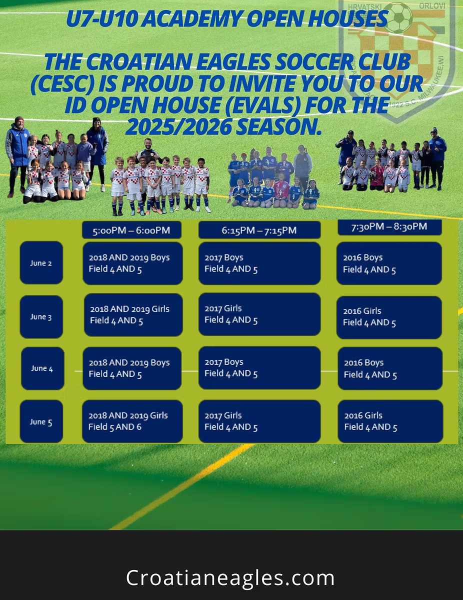 Open houses will be a place where your son or daughter can come and play soccer for free. They will be led by Croatian Eagles Soccer Club Coaches and directors. Players will be exposed heavily to technical, physical and psychosocial components of the game during these sessions.